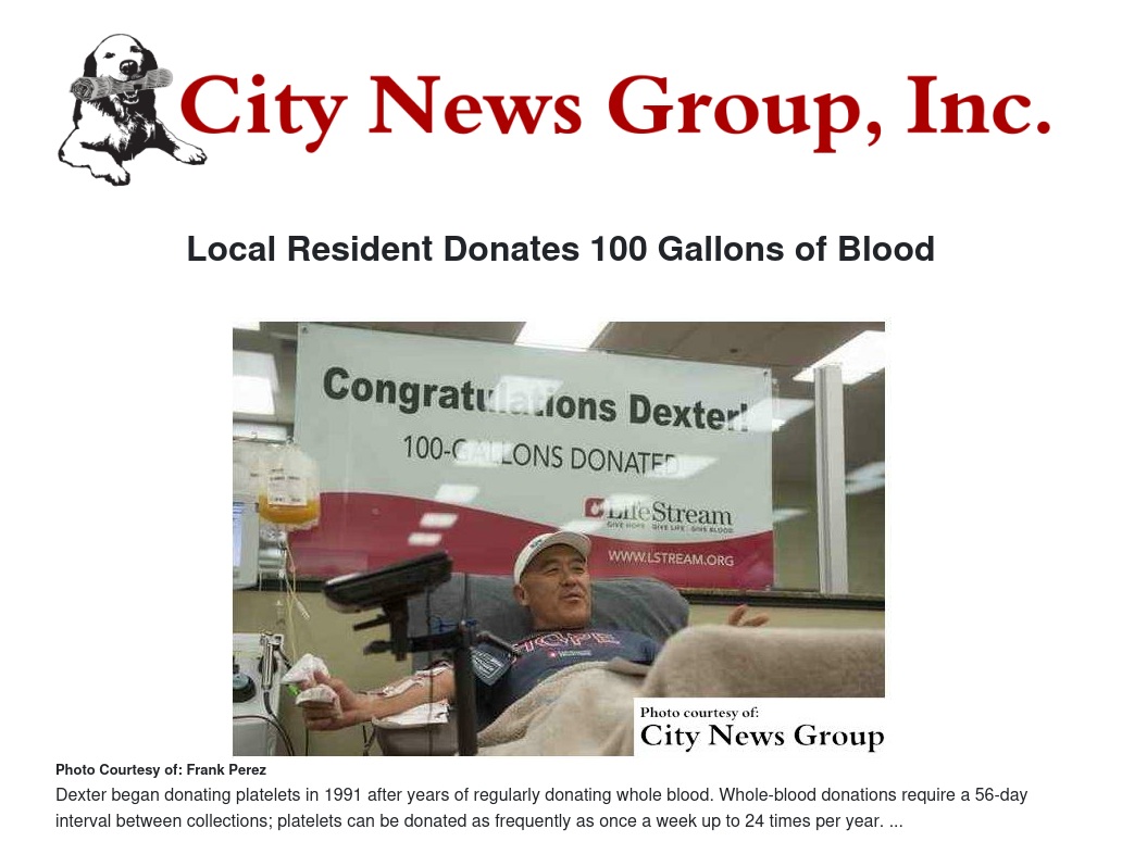 Dexter Emoto was lying in a bed at LifeStream, San Bernardino’s blood bank, where he is a true hero.