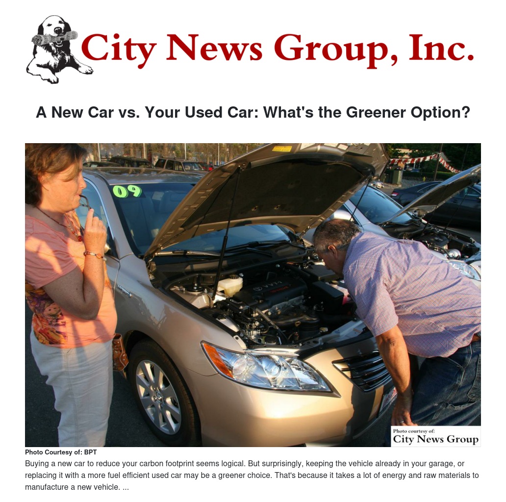Buying a new car to reduce your carbon footprint seems logical. But surprisingly, keeping the vehicle already in your garage, or replacing it with a more fuel efficient used car may be a greener choice. That's because it takes a lot of energy and raw materials to manufacture a new vehicle. "It varies between models, but it is reasonable to estimate building a new $30,000 midsize car will generate greenhouse gases that are the equivalent of 14 metric tons of CO2," says RockAuto.com Vice President, Tom Taylor.