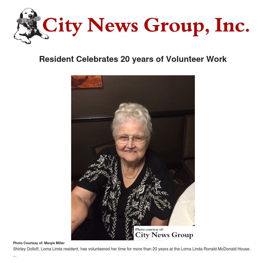 LOMA LINDA>> As a longtime resident of the Inland Empire, Shirley Dolloff has volunteered her time for more than 20 years to the Loma Linda Ronald McDonald House.