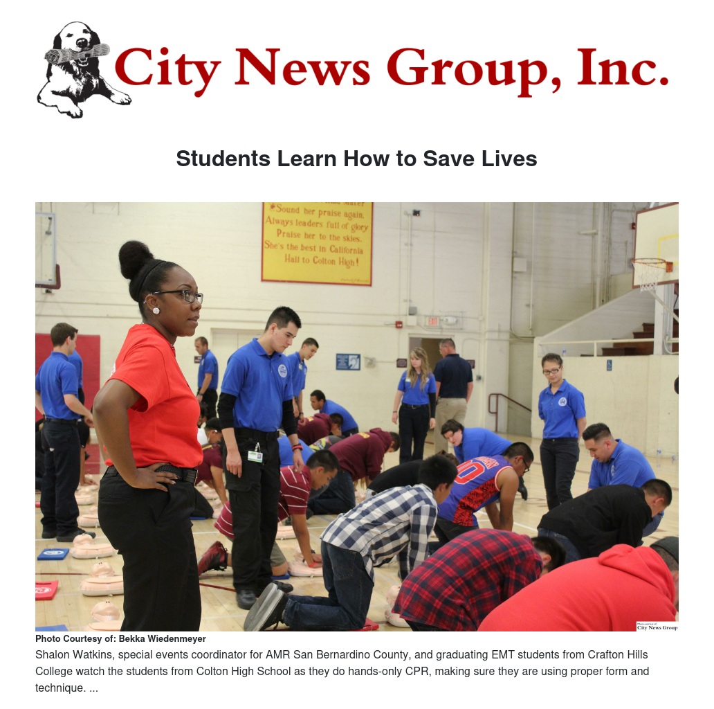 “This is a wonderful school in a great area,” said Robert Coster, account executive for AMR San Bernardino County. “We’re trying to impact the San Bernardino County, so we’re trying to make a difference. Each one of these students that we teach is another chance for a save in our county. They’re what actually makes a difference. They’re the heroes, so if they start the compressions and do it until we arrive, they double or triple somebody’s chance of survival. That’s very important to us.”