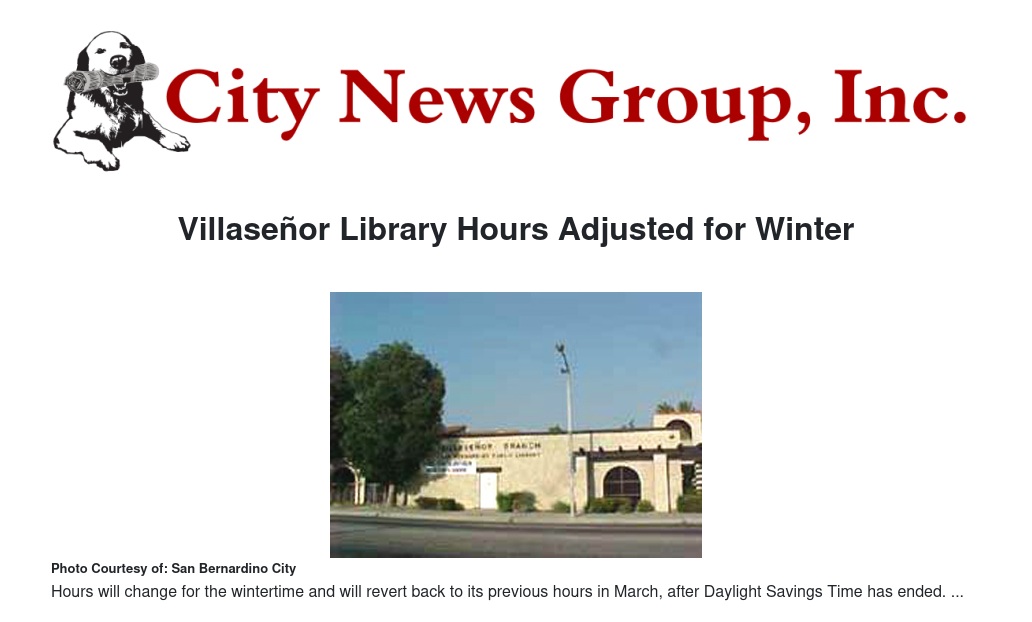 The Villaseñor Branch of the San Bernardino Public Library service hours will change for winter effective since Dec. 1 to be open on Monday and Tuesday from 1 to 6 p.m., following recent action by the San Bernardino Public Library Board of Trustees.
