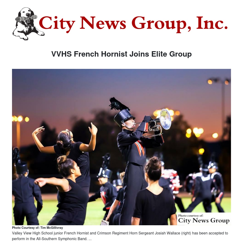 MORENO VALLEY>> There are more accolades for the Valley View High School marching band as junior French Hornist and Crimson Regiment Horn Sergeant Josiah Wallace has been accepted to perform in the All-Southern Symphonic Band.