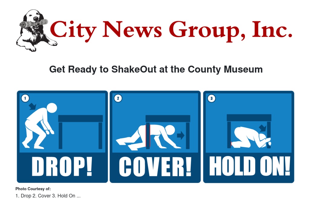 The Great California ShakeOut is an annual drill, this year scheduled for Oct. 16 at 10:16 a.m. Schools, businesses, government agencies, and individuals will Drop, Cover, and Hold On to practice how to react during an earthquake. This year, the County Museum decided to hold a special ShakeOut event on the Saturday before the drill.