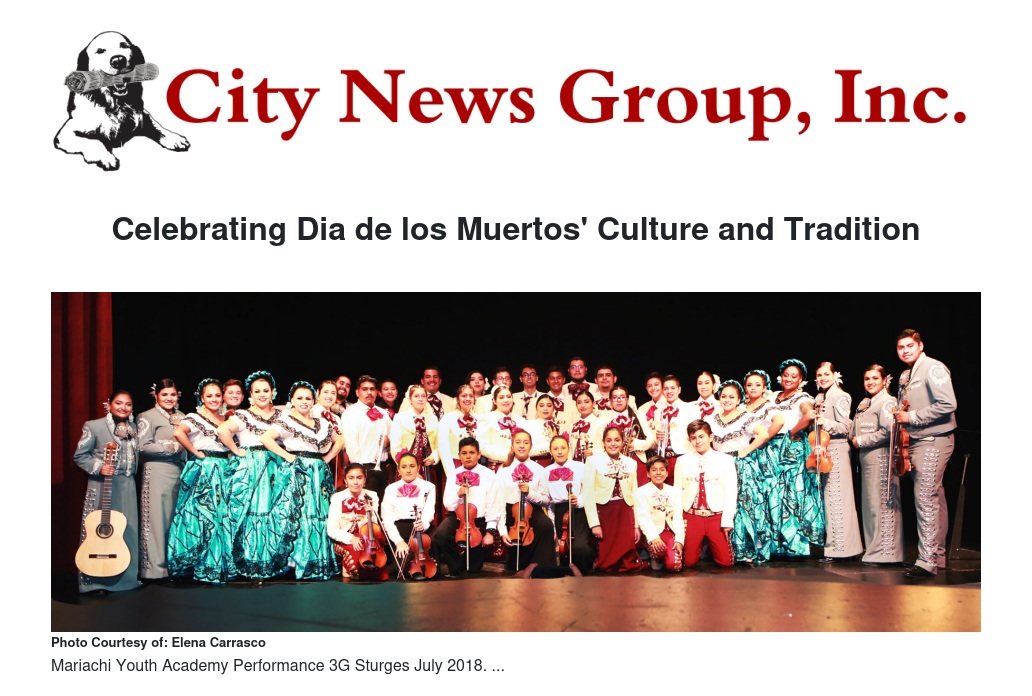 Sinfonia Mexicana Mariachi Youth Academy will present a “Dia de los Muertos Concert – A Tribute to the Music of Coco” to raise funds for its music education program.  Featured performers will include the Youth Academy, Mariachi Voces de Jalisco, Los Hermanos Baeza, and Ballet Folklorico Flores del Desierto.  The concert is on Sunday, October 21, 2018, 3:00 PM. at Whitmer Auditorium, Colton High School, 777 W. Valley Blvd., Colton, CA  92324.