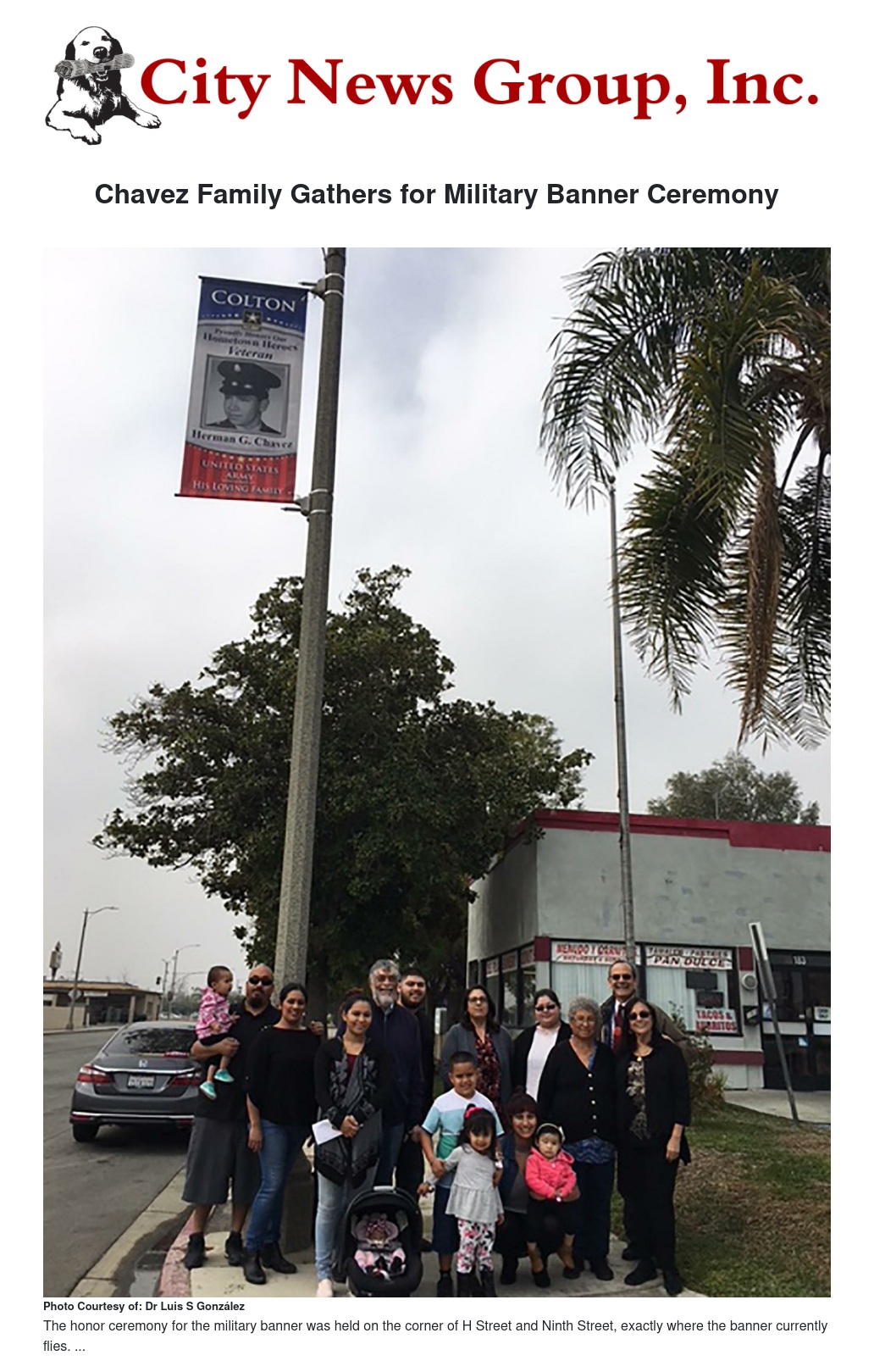The honor ceremony for the military banner was held on the corner of H Street and Ninth Street, exactly where the banner currently flies. “I was very grateful we were able to celebrate the memory of our loved one,” says Alice, wife of Herman Chavez, who together lived at their H Street address for the last 13 years. The ceremony included participation of several family members, in addition to the guest speaker and family friend, Dr. G. The great-grandkids, (Jayden, Jazlyn) held the set of U.S. flags; the national anthem was sung by grand-daughter Kayla, and family “short-talks” were presented by Jason (grandson), Rudy (son in-law), and daughter Renee. Jason was also recognized for spearheading the planning of this banner project.