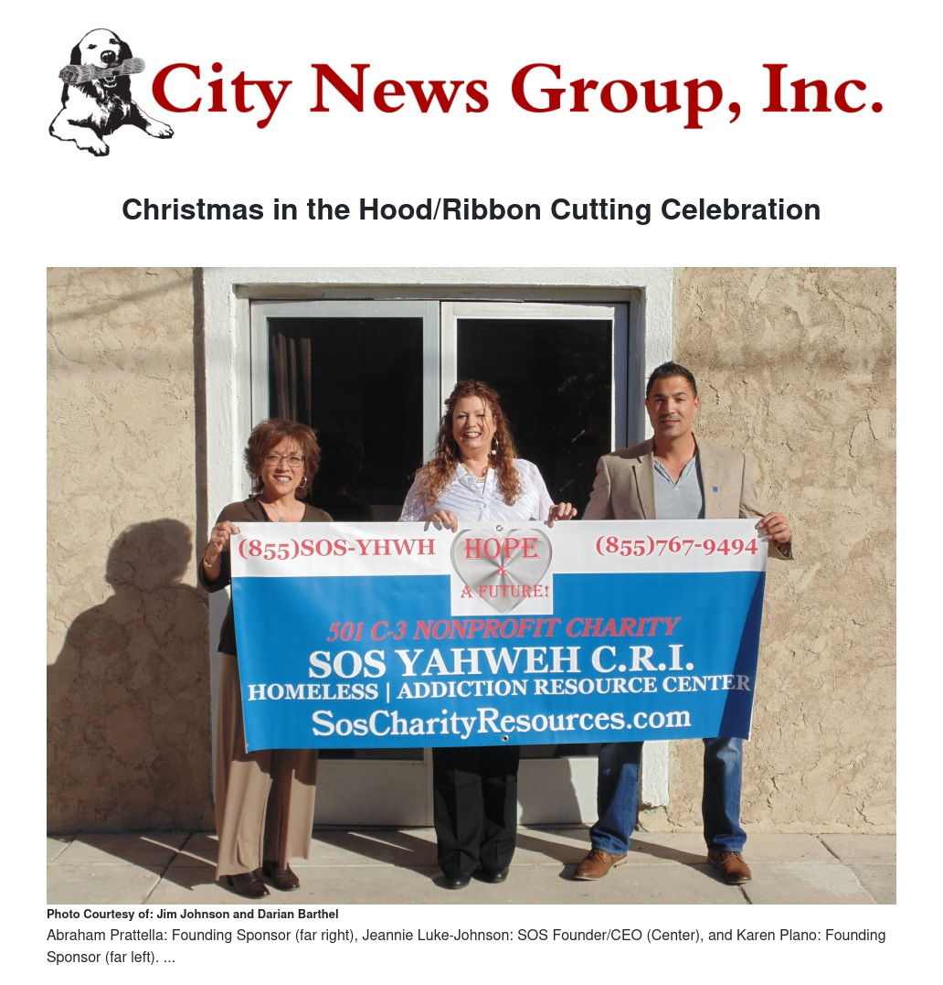 SOS Yahweh Charity Resources, Inc. is opening a Homeless | Addiction Community Resource Center. We are celebrating our Third Anniversary with a Ribbon Cutting and Community Christmas Celebration at our new location at 725 North D Street, San Bernardino, CA 92401 on Saturday, December 22 from 10AM – 2PM. Ribbon Cutting will be at NOON followed by Gifts & Prizes.