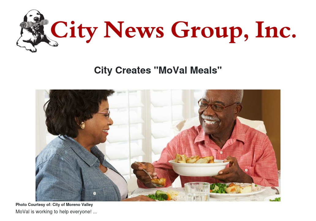 Beginning Tuesday, March 24, seniors age 60+ and disabled persons in Moreno Valley will have some help supplementing their food supplies with the launch of a new City service called "MoVal Meals." The free service, which provides both pick-up and delivery options, will offer a week's supply of mostly staples, such as beans, rice, or pasta and more. Offerings will likely change slightly from week to week.