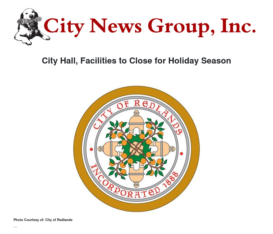 City offices, including City Hall, will close on Wednesday, Dec. 20, and reopen Tuesday, Jan. 2. The Redlands Community Center, Redlands Community Senior Center, Joslyn Senior Center and Senior Transportation program will also be closed during that time.