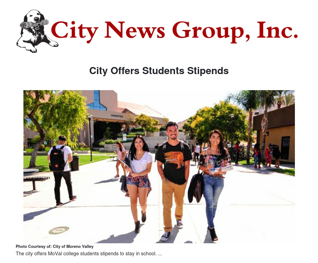 The City of Moreno Valley is partnering with Moreno Valley College to offer students a monthly stipend to help them stay in school. Starting this fall, “MoVaLEARNS – Mayor’s Challenge” will provide Moreno Valley College Career and Technical Education (CTE) students in good standing a $250-a-month stipend for eight months – a total of $2,000 for the school year.