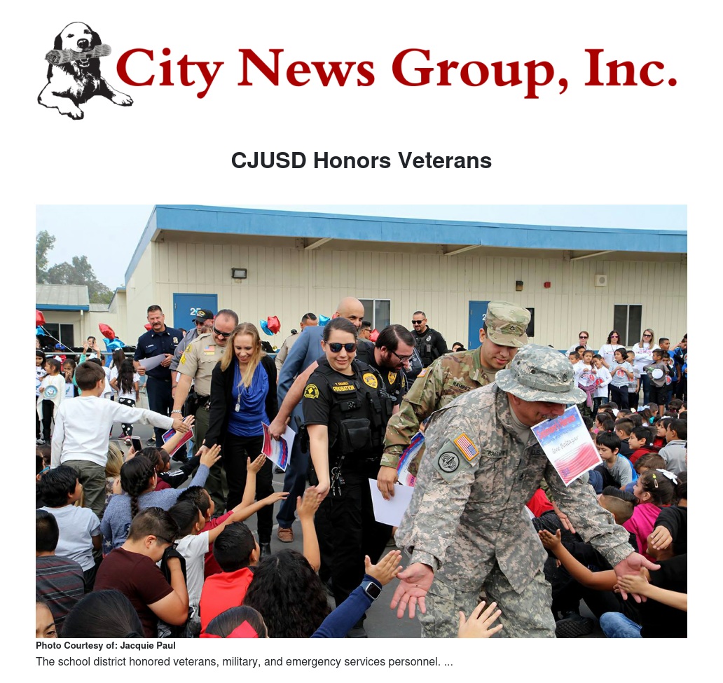 Programs included student performances, speeches, the posting of colors, history lessons, special meals, and moments of silence. Veterans and active duty military personnel were the guests of honor at these events. Many of those who attended the ceremonies are family members of current students or attended our schools themselves. Some are CJUSD staff members.