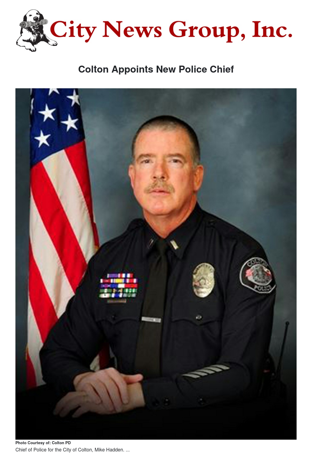 On December 8, 2018, Mike Hadden was appointed Chief of Police for the City of Colton, replacing retiring Chief Mark Owens. Chief Hadden began his service with the Colton Police Department in 1989 as a patrol officer. In 1991, he was assigned to the Traffic Unit and in 1992 to motorcycles.