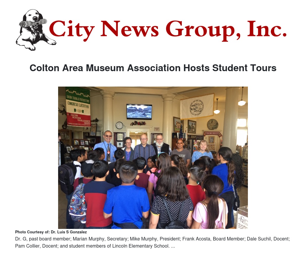 Over the last two weeks, the Colton Area Museum Association (CAMA) has ramped up its community outreach by hosting the first of a series of student tours to promote the rich and legendary history of the City of Colton. Students from Lincoln Elementary School under the direction of teachers Mrs. Segura, Mr. Hall, Mrs. Peterson, and Mrs. Macias, took to the streets for a walking field trip, and headed south from their Olive Street campus to an exciting tour of the Colton Area Museum. “It was a great trip…a very good learning experience,” says teacher Mr. Delgado, one of the accompanying teachers on the trip.