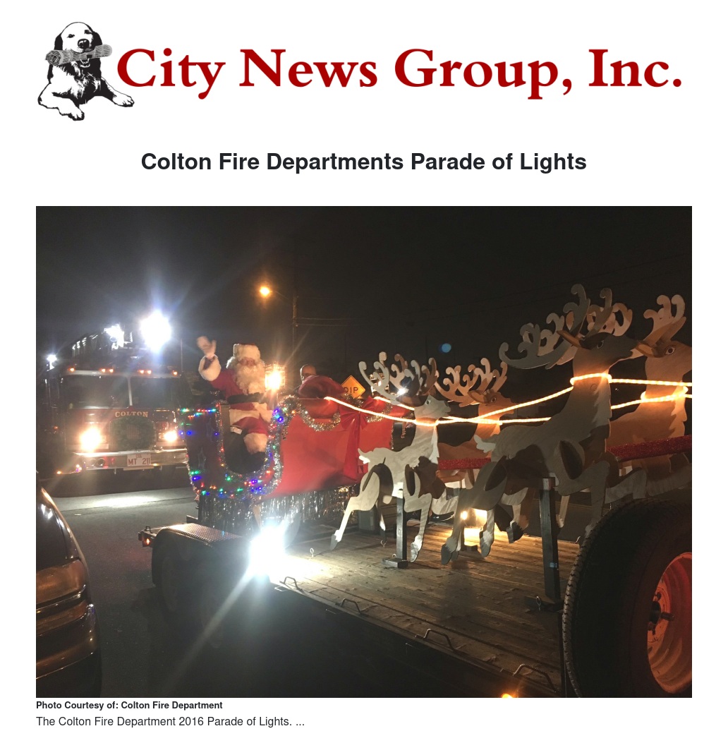 Beginning Monday, December 10th through Saturday December 15th, the Colton Fire Department will be presenting our annual “Parade of Lights”. At dusk, Fire units adorned with Christmas lights will caravan throughout the neighborhoods and escort Santa Claus on a decorated sleigh. Candy canes will be distributed to the children by Santa and Fire Department personnel. Residents should be aware that the use of emergency sirens will announce the parade in each neighborhood. Due to the size of the city, the parade will be conducted on six separate nights.
