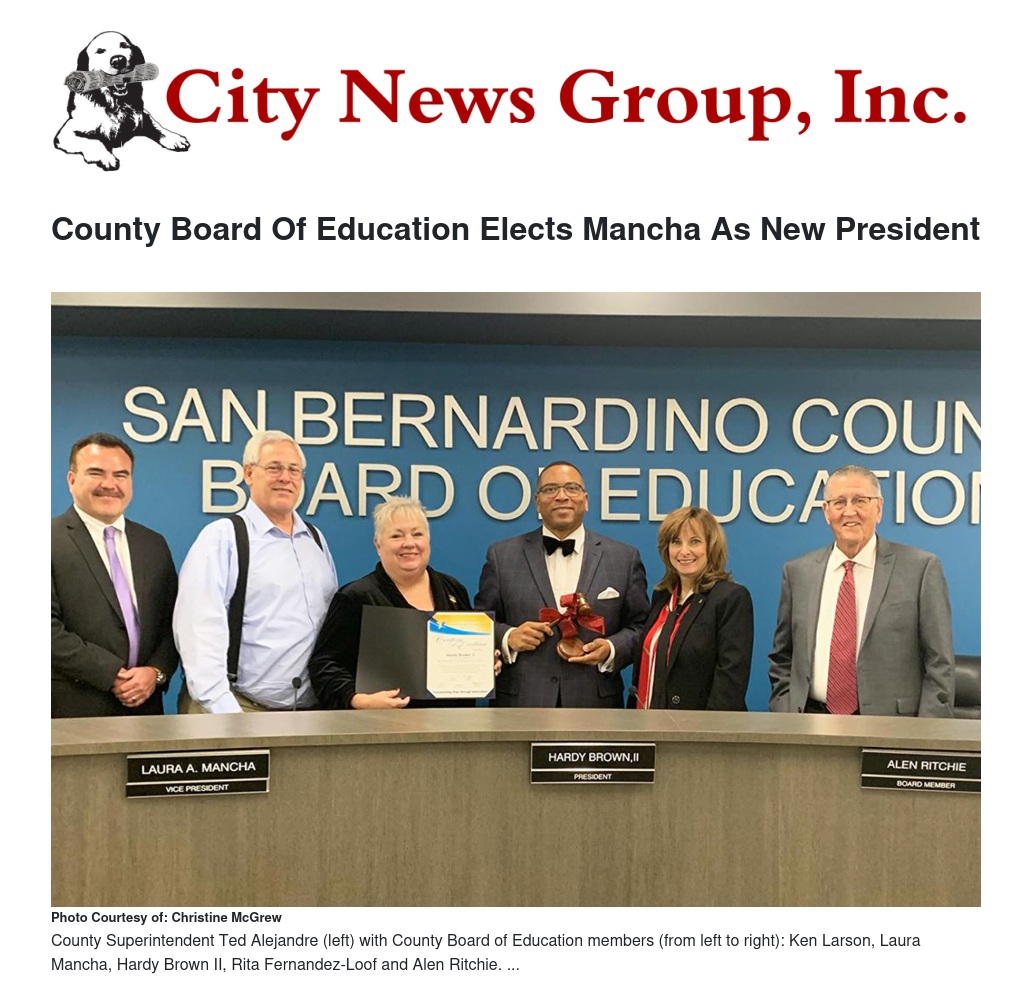 Mancha, who will serve a one-year term, represents Trustee Area C, which includes the school districts of Chaffey Joint Union, Chino Valley, Cucamonga, Fontana, Mountain View and portions of Ontario-Montclair. She replaces Hardy Brown II, whose one-year term ended on Dec. 2.