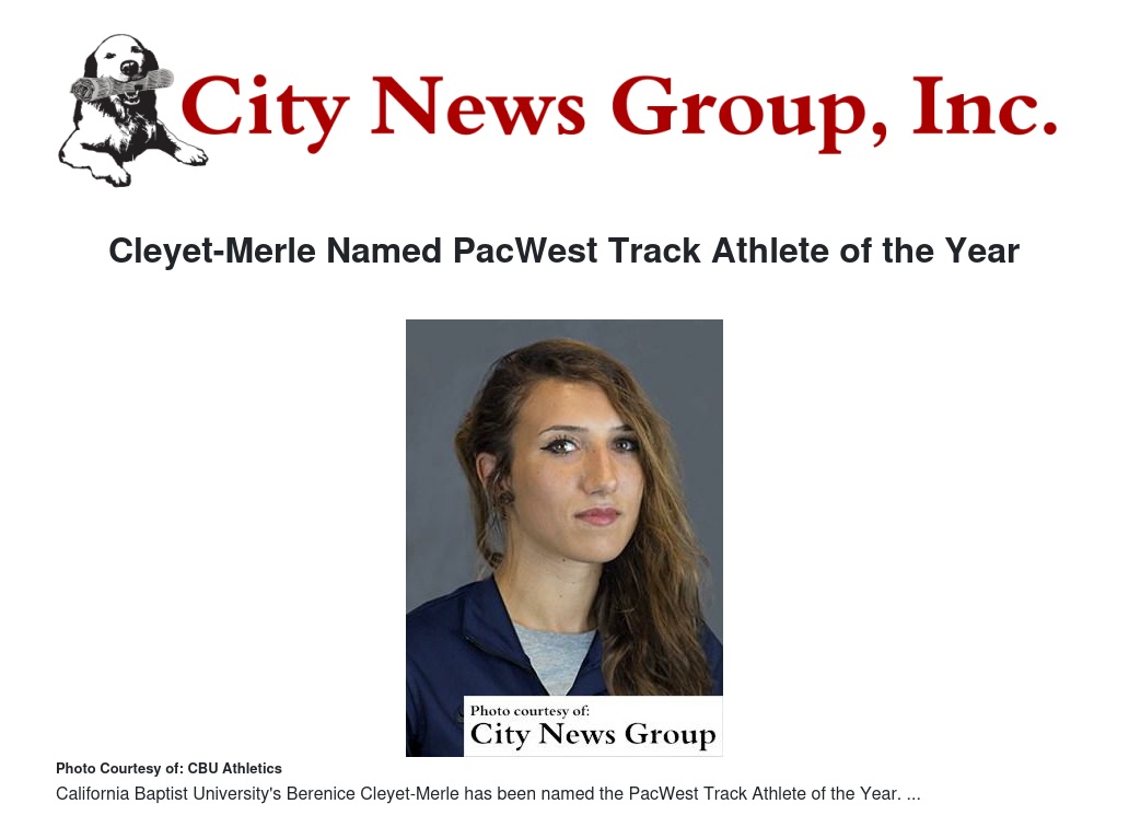 RIVERSIDE >> After a stellar collegiate debut, California Baptist University's Berenice Cleyet-Merle was named the PacWest Track Athlete of the Year, announced Wednesday, June 8.