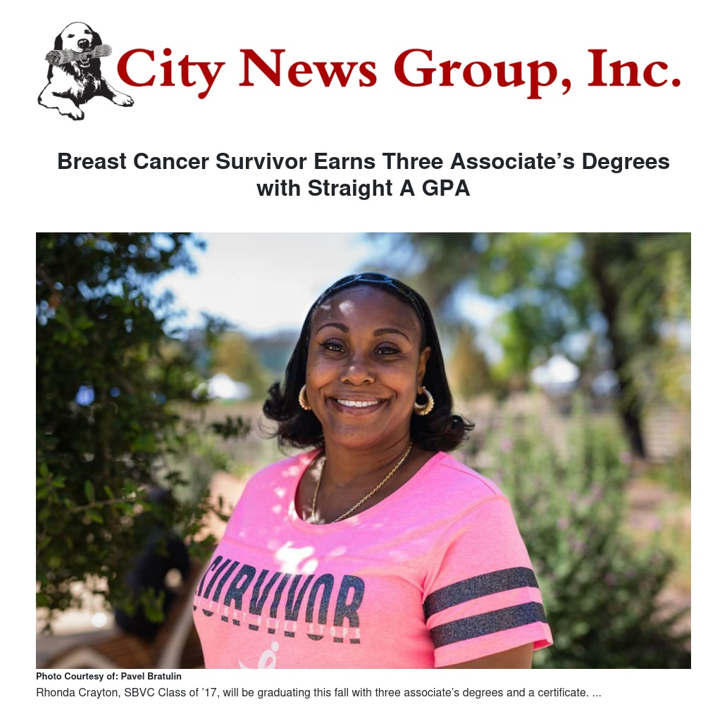 Her doctor gave her permission to return to work in October, and Crayton — mom to Jasmine, 24, and Tiffany, 20 — is now also involved in SBVC’s EOPS program, SBVC’s Honor Society, and her church. After she graduates this fall, Crayton would like to work at a high school or college as a counselor, helping young adults who need support and guidance.