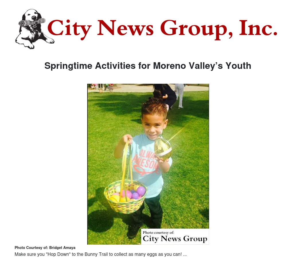 On Saturday, March 19, a FREE Easter Egg Hunt will be held for youth ages 2 to 12 at Sunnymead Park located at 12655 Perris Blvd. at 9 a.m. sharp.