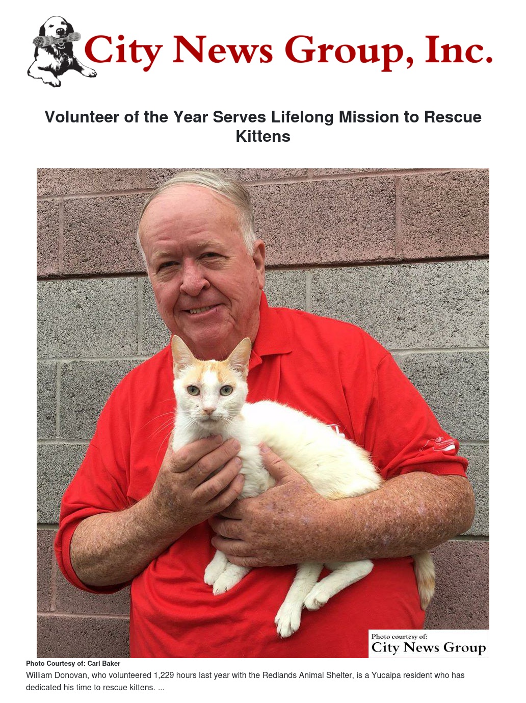 REDLANDS>> William Donovan, who volunteered 1,229 hours last year with the Redlands Animal Shelter, was recently named the shelter’s 2016 Volunteer of the Year. He has had a nearly lifelong mission to rescue kittens.