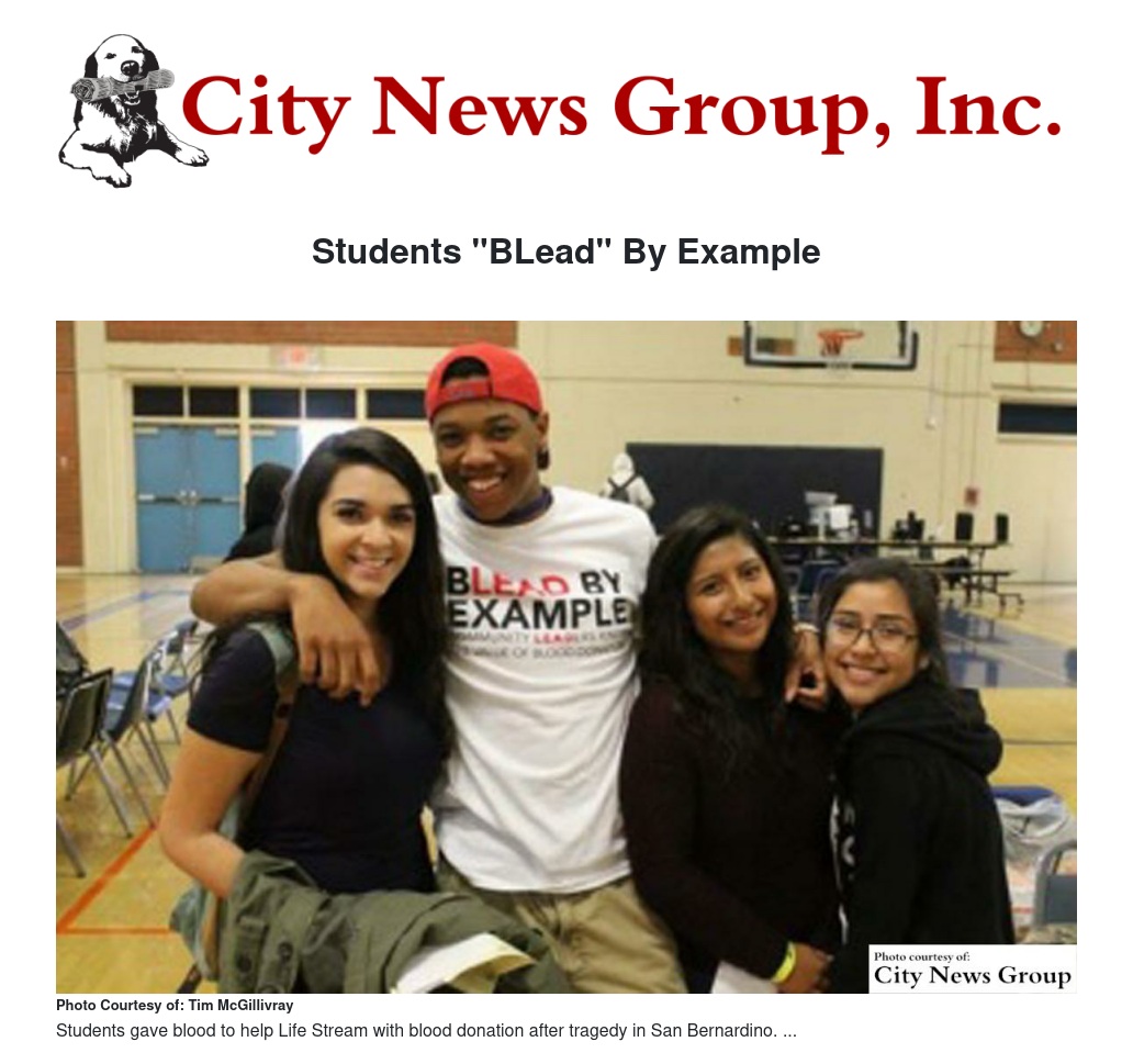 In the wake of the tragedy in San Bernardino, students were left wondering how they could respond in a meaningful way. Moreno Valley High students and staff decided to “BLead by Example” and gave 144 pints of blood to help replenish depleted blood supplies at regional hospitals that cared for victims. The blood drive, conducted by LifeStream, came just in time, as the need for blood typically spikes around Christmas and the New Year.