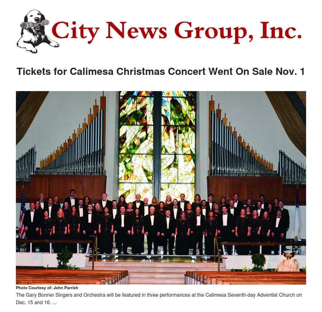 Tickets for the annual Christmas concert presented by Calimesa Community Concerts went on sale on-line on Nov. 1, according to its Calimesa sponsors. The Gary Bonner Singers and Orchestra will be featured in three performances at the Calimesa Seventh-day Adventist Church on Dec. 15 and 16.
