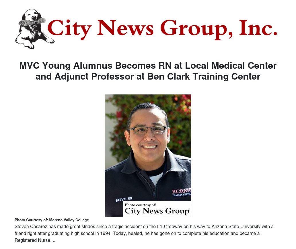 After graduating from MVC, Casarez earned his nursing degree at Riverside City College. Today he works at the Riverside County Regional Medical Center's Level II trauma center. He also teaches at the Ben Clark Public Safety Training Center, helping prepare hundreds of students each year to work in public safety fields and works for American Medical Response as a nurse handling critical care transfers.