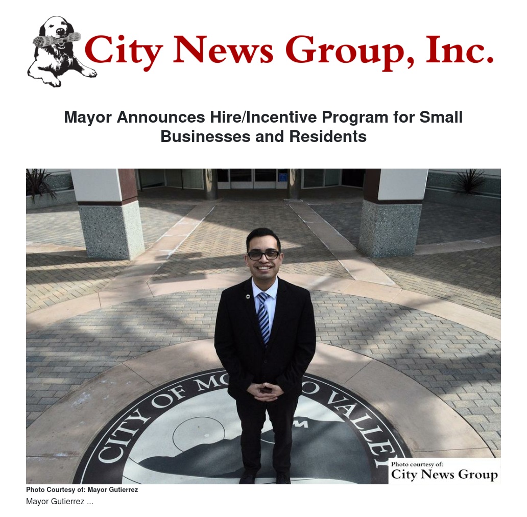 MORENO VALLEY >> "As Mayor of Moreno Valley, I am excited to announce that the City Council approved the Hire MoVal to Small Businesses program. As you may know, this is an initiative that I have championed and sponsored to bring more local jobs to Moreno Valley as well as attract new businesses to our City and support our existing businesses," said Mayor Yxstian Gutierrez.
