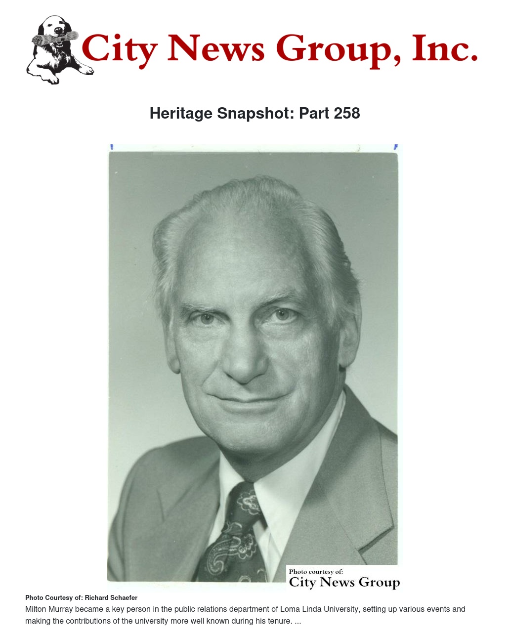 LOMA LINDA>> In 1949, Milton J. Murray became the first person hired by the Loma Linda College of Medical Evangelists (now Loma Linda University) to focus specifically on public relations activities. His interest in public relations started soon after being honorably discharged from the United States Army on October 31, 1945, when he became a linotype operator at the Ketchikan Chronicle, in Alaska. The job opened his eyes to a new profession.
