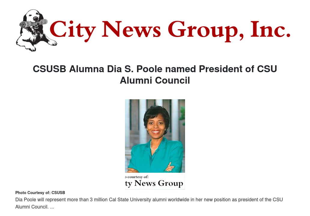 Dia S. Poole ’90 was recently named president of the California State University Alumni Council, joining fellow CSUSB alumnus Lou Monville ’94 in CSU leadership positions.