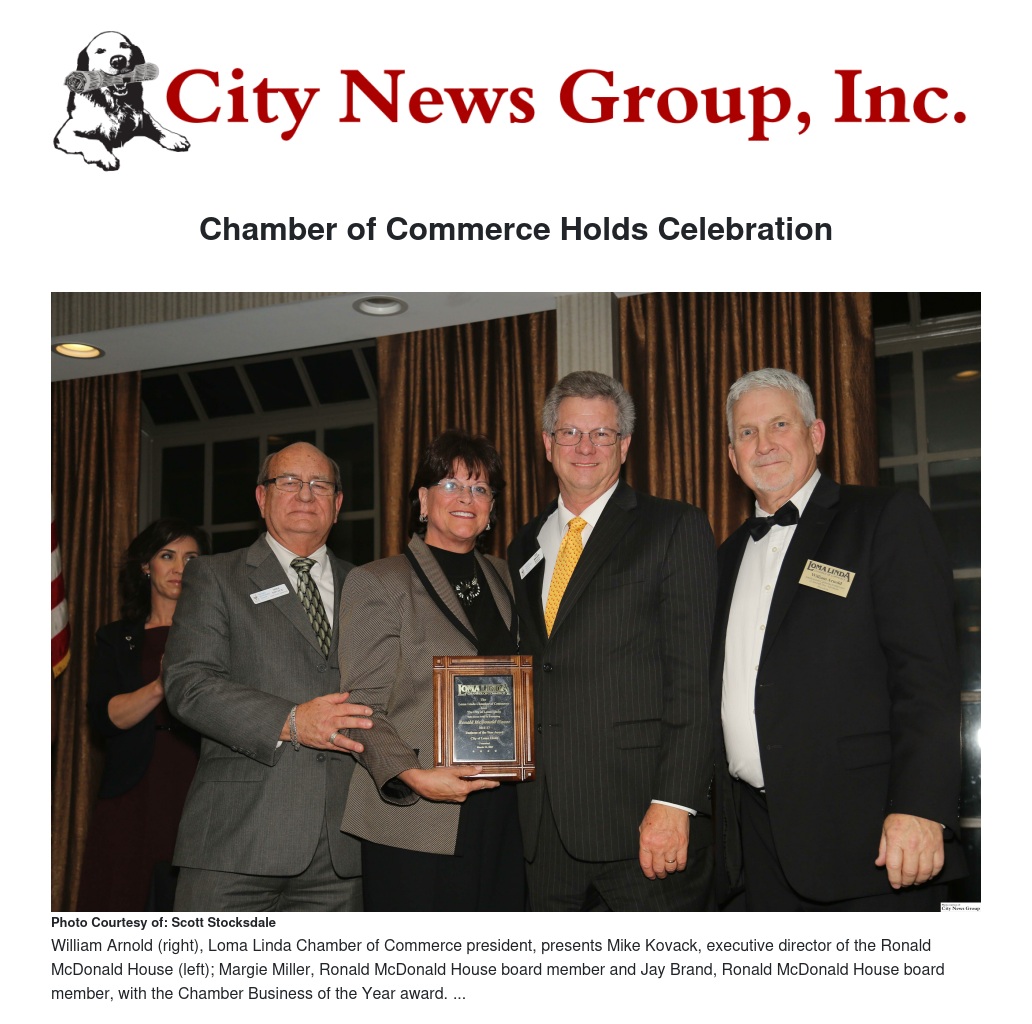 Jay Brand, board member of the Inland Empire Ronald McDonald House was present along with Mike Kovack, executive director of the Inland Empire Ronald McDonald House, to accept the award.