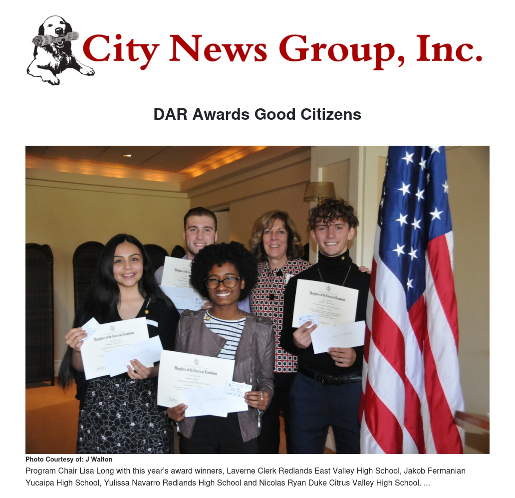 Arrowhead Valley Chapter held their annual DAR Good Citizen Award program on February 8, 2019. This year’s program featured students from Redlands East Valley High School, Yucaipa High School, Redlands High School, and Citrus Valley High School. Program Chair Lisa Long introduced this year’s award winners, Laverne Clerk, Jakob Fermanian, Yulissa Navarro and Nicolas Ryan Duke. Each of the four Good Citizen Award winners read their essays on the topic “Our American Heritage and Our Responsibility to Preserve It. What New Challenges Will We Face?” Following their presentations, Long presented each student with a NSDAR Good Citizens Pin, Certificate, wallet card and a monetary gift from Arrowhead Valley Chapter NSDAR.