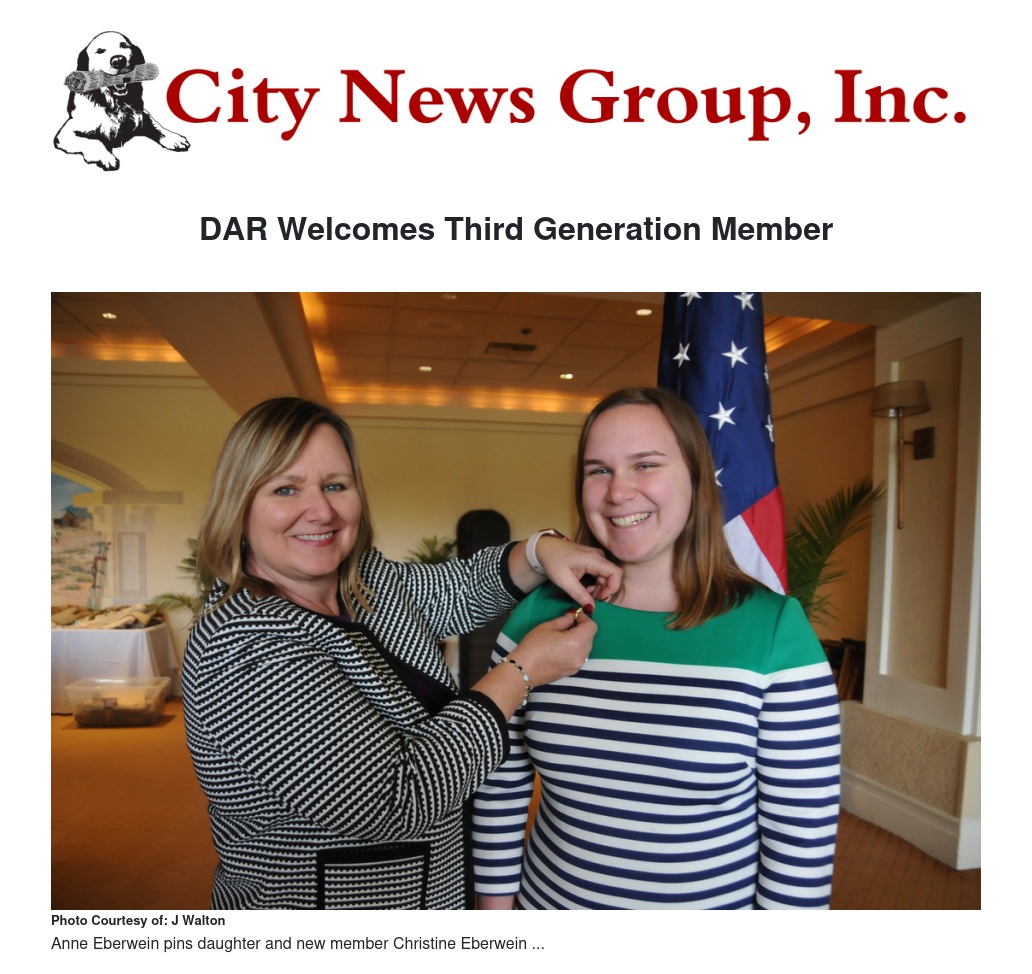 Arrowhead Valley Chapter NSDAR met to induct Christine Anne Eberwein to its membership. Mary Camp, Chaplain, gave the oath and offered a prayer. Regent Patricia Westerfield extended a warm welcome. Christine’s mother and grandmother, Anne Eberwein and Kathleen Reid, pinned the new member while grandfather, Al Reid looked on. Christine represents a 3rd generation member in DAR in that her sister, mother and grandmother are all active members of Arrowhead Valley Chapter.