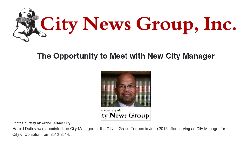Duffey was appointed the City Manager for the City of Grand Terrace this June, and is responsible for the daily operations of this municipal organization. He manages a staff of approximately 35 employees and a budget of nearly $9,000,000.