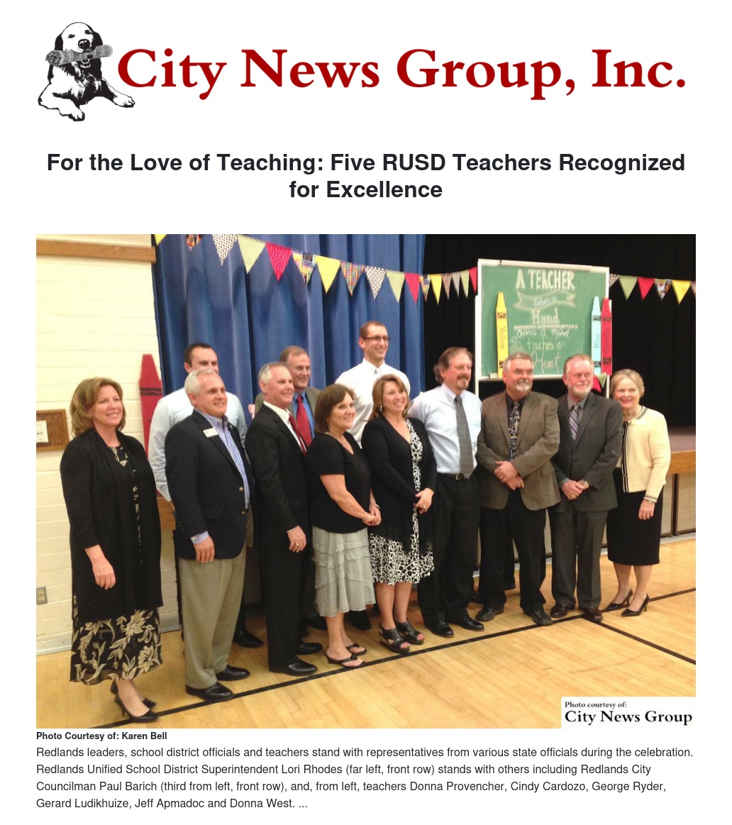 The fifth honoree was Gerard Ledukhuize, who teaches at Clement Middle School. Ludikhuze came to the United States at the age of 5, from Holland. He is a product of the Redlands schools, starting kindergarten as a non-English speaking student. His career in Redlands covers three schools with the last 19 years at Clement Middle school, where he teaches woodshop. He is married to a fellow teacher and both his children are teachers. In the classroom, Ludikhuize uses the inquiry method by letting his students investigate, design and build using their creativity. His love of wood and people, especially his students, shows in his success as a middle school teacher.