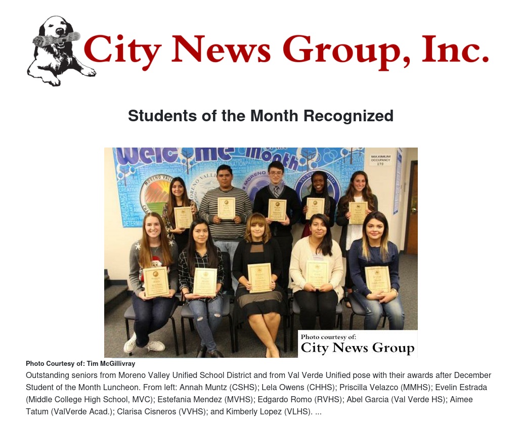 Outstanding seniors from Moreno Valley Unified School District and from Val Verde Unified pose with their awards after December Student of the Month Luncheon. From left: Annah Muntz (CSHS); Lela Owens (CHHS); Priscilla Velazco (MMHS); Evelin Estrada (Middle College High School, MVC); Estefania Mendez (MVHS); Edgardo Romo (RVHS); Abel Garcia (Val Verde HS); Aimee Tatum (ValVerde Acad.); Clarisa Cisneros (VVHS); and Kimberly Lopez (VLHS).