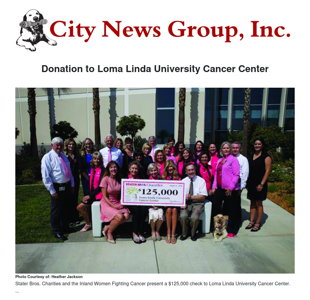 Stater Bros. Charities and the Inland Women Fighting Cancer presented a check for $125,000 to Loma Linda University Cancer Center on Aug. 21. The funds were a portion of those raised at the 10th annual Believe Walk in October 2017.