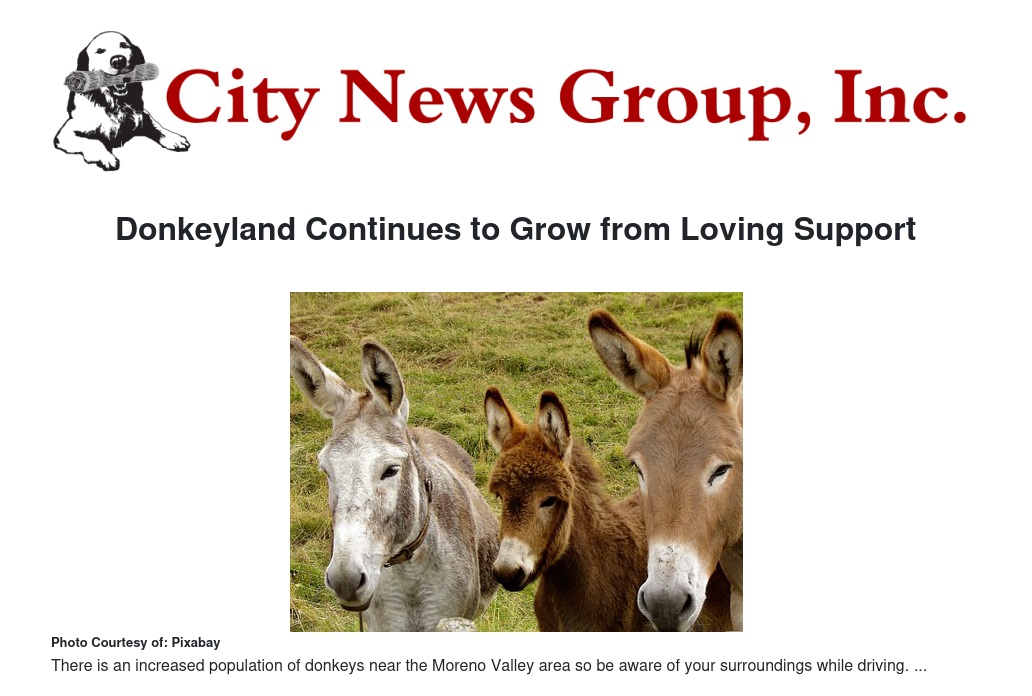 If you have ever driven through Reche Canyon there is a chance you may have witnessed a donkey walking freely through the street. Some of these donkeys or burros might have been rescued by an organization called Donkeyland.