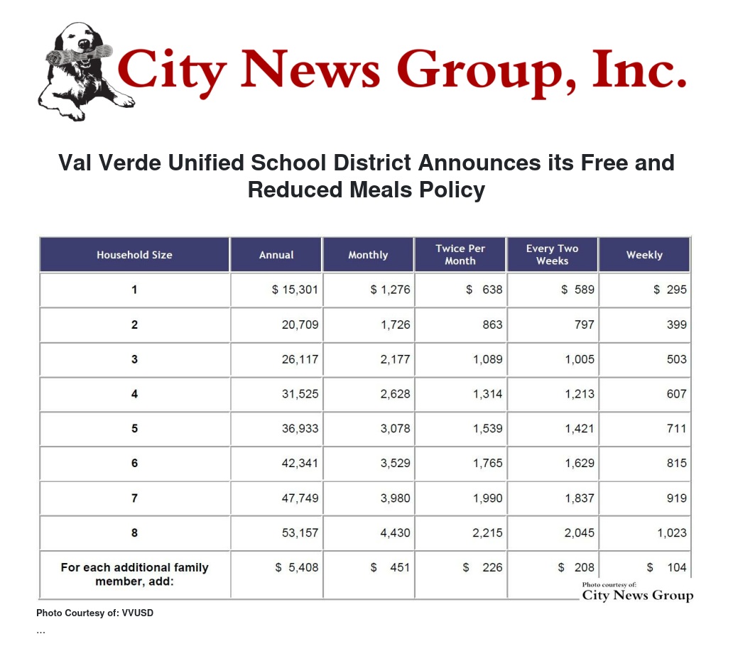 Val Verde Unified School District announced its policy for providing free and reduced-price meals for children served under the National School Lunch Program and/or School Breakfast Program.
