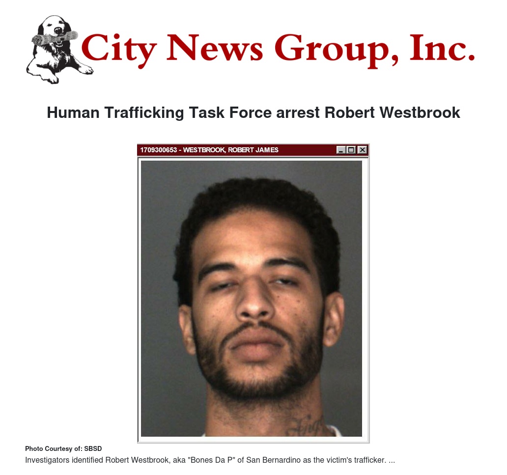 On September 13, 2017, Investigators assigned to the San Bernardino County Human Trafficking Task Force, assisted the San Bernardino Police Department with an investigation regarding the sexual exploitation of a minor.  San Bernardino Officers observed the victim loitering in the area of West 10 Street and North G Street.  Officers detained the female for loitering with the intent to commit prostitution.  During the contact, Officers determined the victim was in fact a minor and a reported runaway out of Riverside County.  Human Trafficking Investigators assisting in the investigation determined the minor was involved in commercialized prostitution and a victim of Human Trafficking.  Investigators identified Robert Westbrook, aka "Bones Da P" of San Bernardino as the victim's trafficker.  Westbrook was located and arrested at a motel located on the border of the cities of San Bernardino and Colton.  During his arrest, a second victim was located and interviewed.  As a result, Investigators determined she was also a victim of commercialized prostitution and Human Trafficking by Westbrook.  Both victims were rescued, taken to a safe location, and provided services.  The juvenile victim was released to the Los Angeles County Family and Child Services Investigators to be safely returned home.  Westbrook was transported to the Central Detention Center and booked for multiple felonies related to pimping, pandering, sexual exploitation of a minor, and human trafficking.  A bail increase in the amount of $1,000,000 was granted by a San Bernardino County Superior Court Judge.