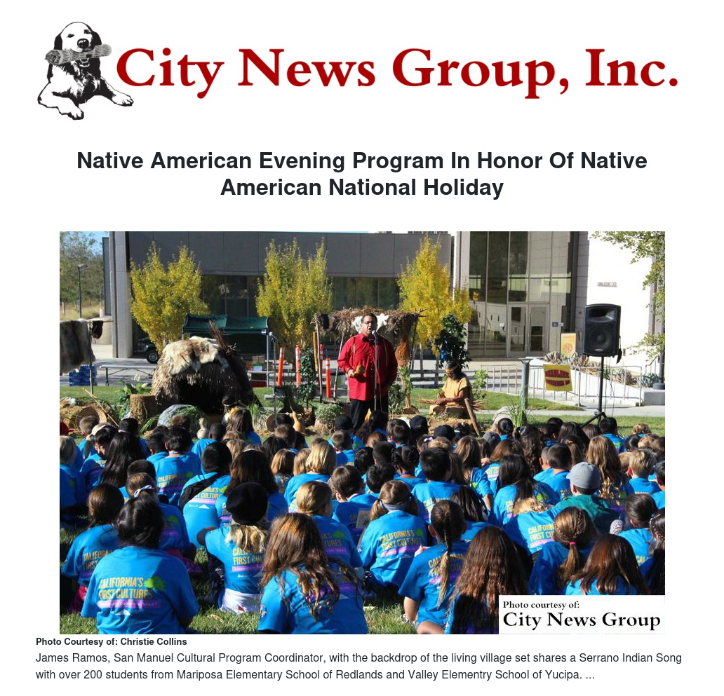 Nearly 500 Redlands and Yucaipa fourth graders learned, and celebrated, the cultures and histories of the Serrano and Cahuilla tribes of San Bernardino and Riverside counties during the annual California's First Cultures: A Celebration at Crafton Hills (Waa’t) on Nov. 19 and 20.