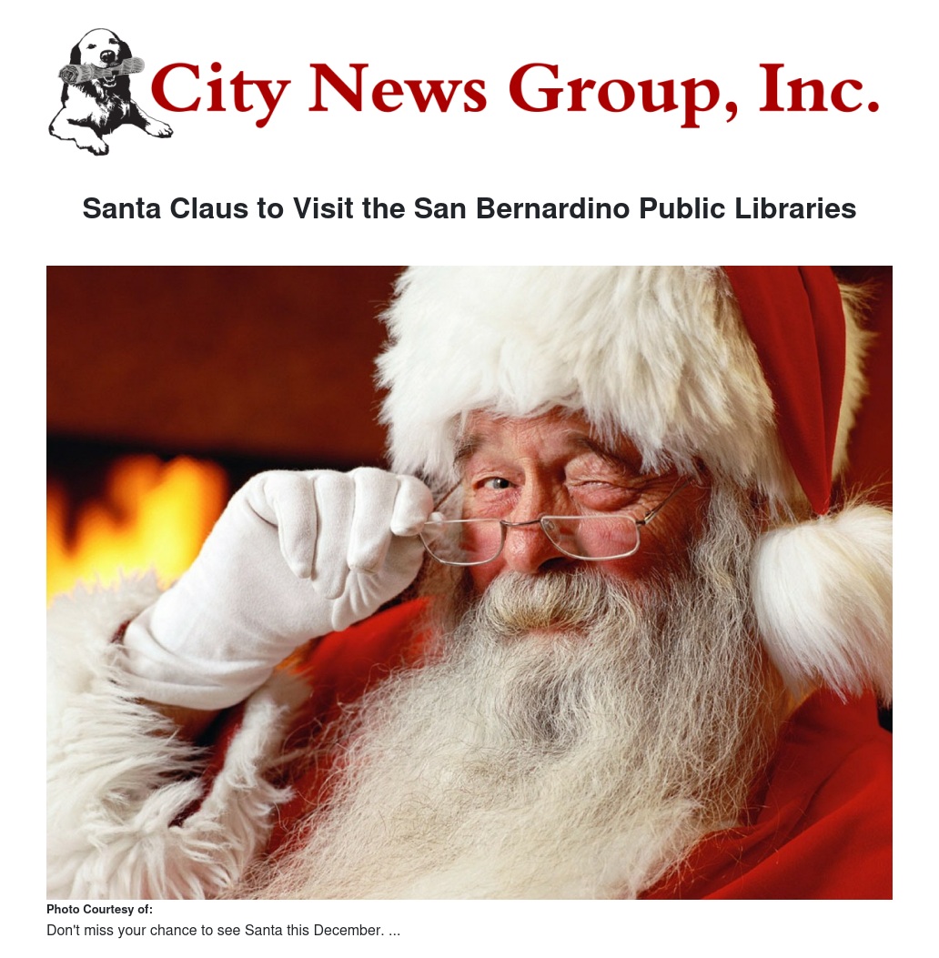 The San Bernardino Public Library will host visits by Santa Claus at all four of our city libraries this holiday season.