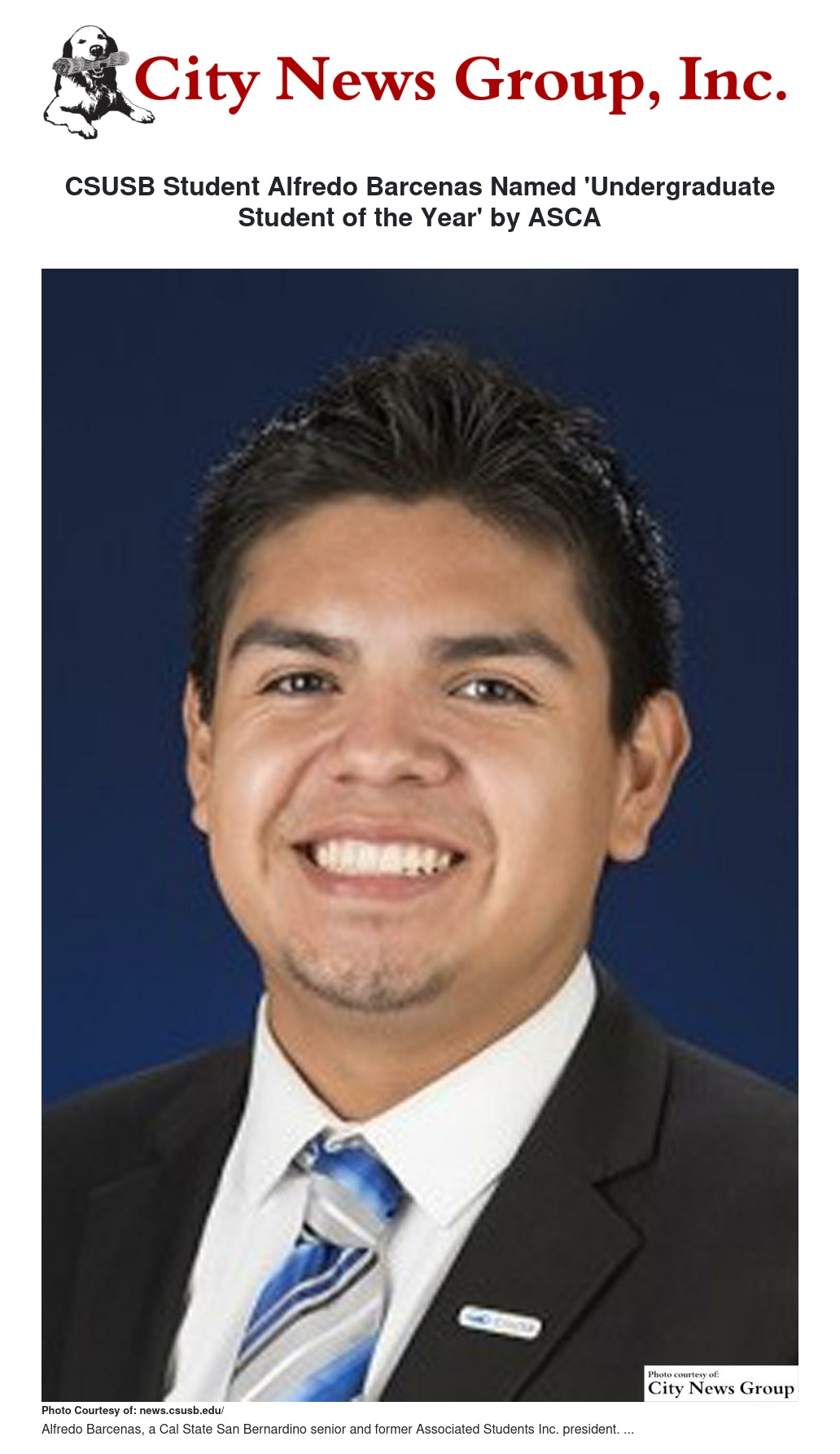 Alfredo Barcenas, a Cal State San Bernardino senior and former Associated Students Inc. president, is the 2016 recipient of the Undergraduate Student of the Year Award by the Association for Student Conduct Administration.