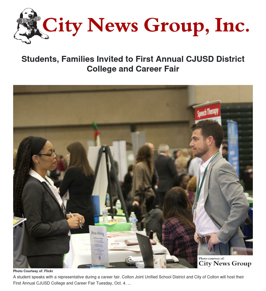 COLTON>> Students of all grade levels and their families are encouraged to attend the First Annual CJUSD College and Career Fair, to be held from 5-8:30 p.m. Tuesday, Oct. 4 at the Gonzales Community Center, 670 Colton Avenue in Colton.