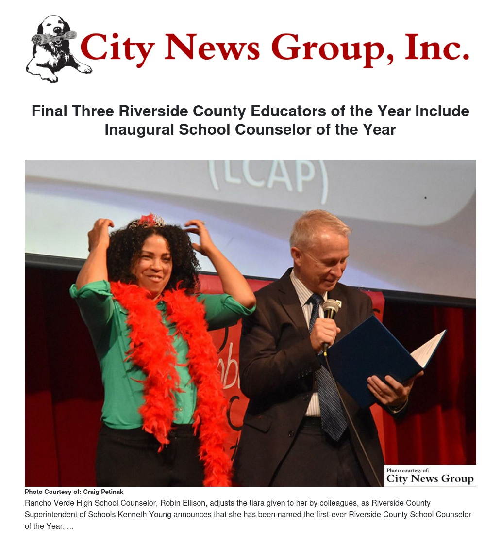A round of applause erupted from students gathered in the school’s theater after Riverside County Superintendent of Schools, Kenneth M. Young, said “The new award recognizes the outstanding work of counselors across the county and Mrs. Ellison has the honor of going directly to a national competition.”