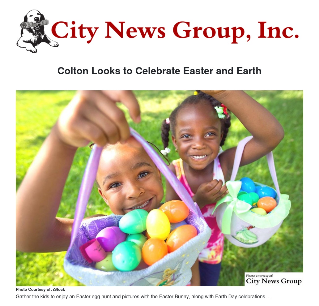 Families are invited to join the City of Colton's Community Services Department at Rich Dauer Park on Saturday, April 4 to enjoy a free Easter egg hunt and Earth Day celebration.