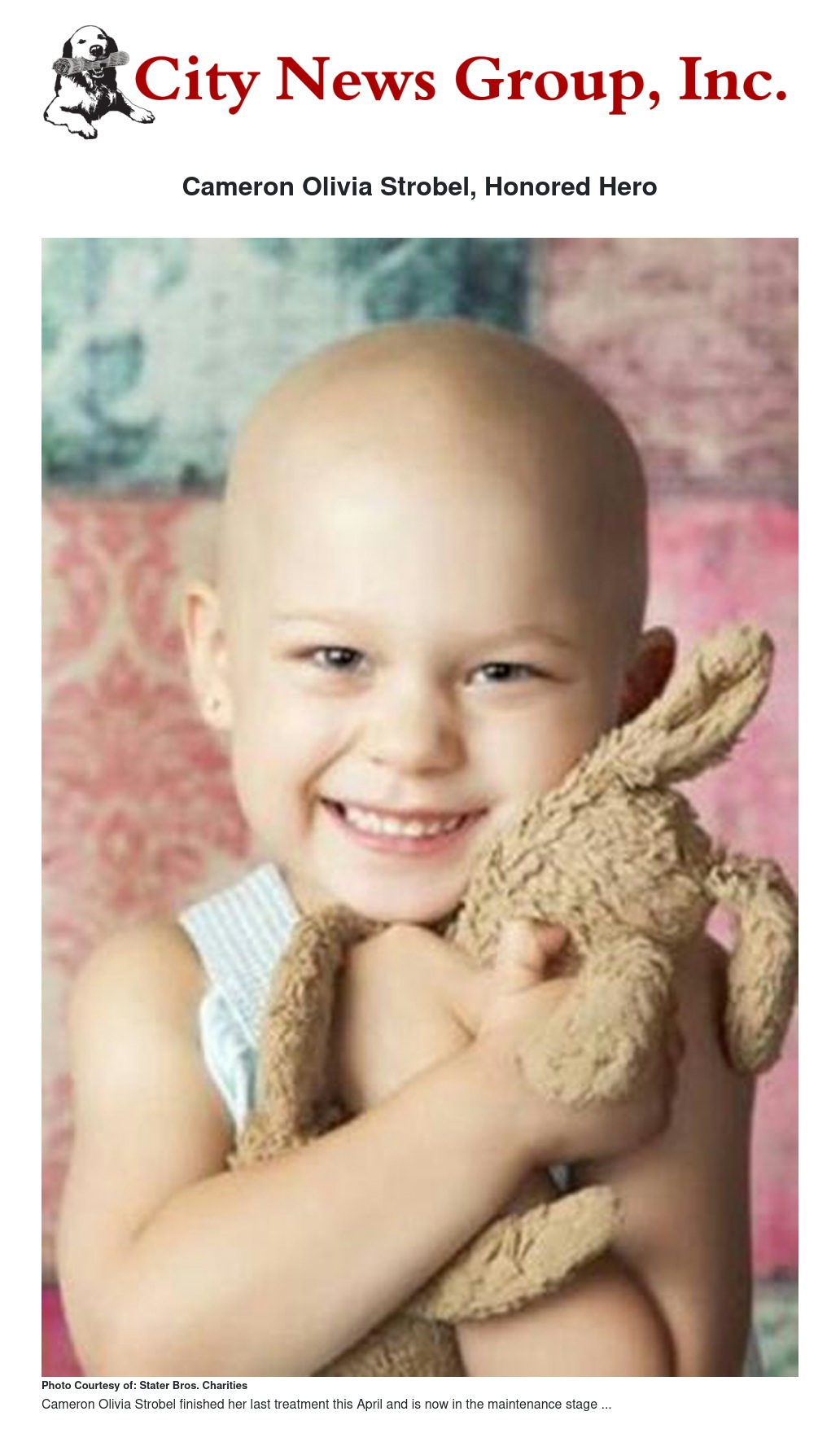 Cameron is a beautiful 5-year-old warrior currently battling acute lymphoblastic leukemia (ALL). She was diagnosed on February 22, 2012, had her last treatment on April 26, 2014, and is currently in the maintenance stage.