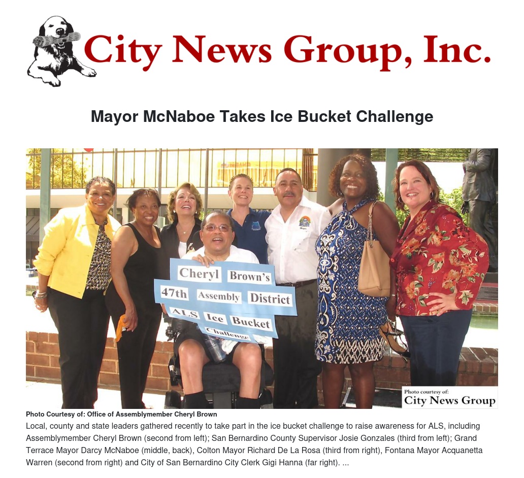 McNaboe was among several officials led by Assemblymember Cheryl Brown (D-San Bernardino) who took part recently in the Ice Bucket Challenge, with the goal to raise awareness about Amyotrphic Lateral Sclerosis (ALS) disease.