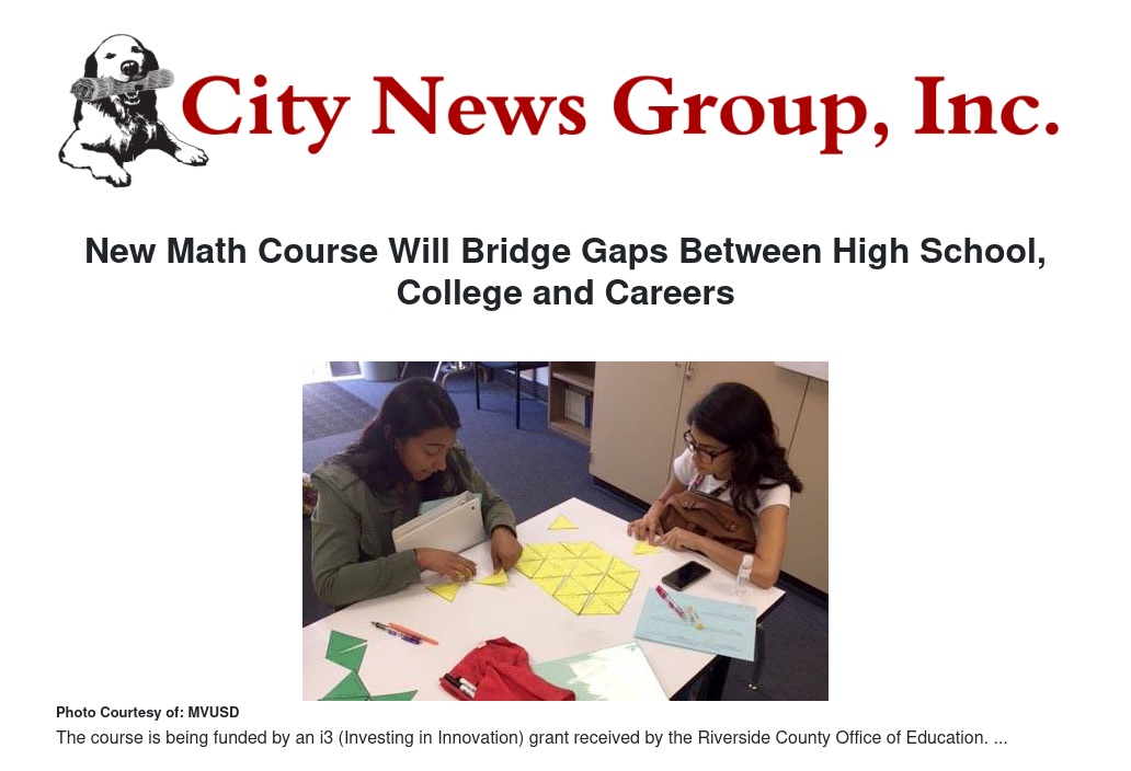 The course is being funded by an i3 (Investing in Innovation) grant received by the Riverside County Office of Education. High School math teachers Richard Macpherson, Steven Barrios, Kristin Xolapa and Yvonne Neiburger are implementing the course at Canyon Springs, Moreno Valley, Valley View and Vista Del Lago High Schools.