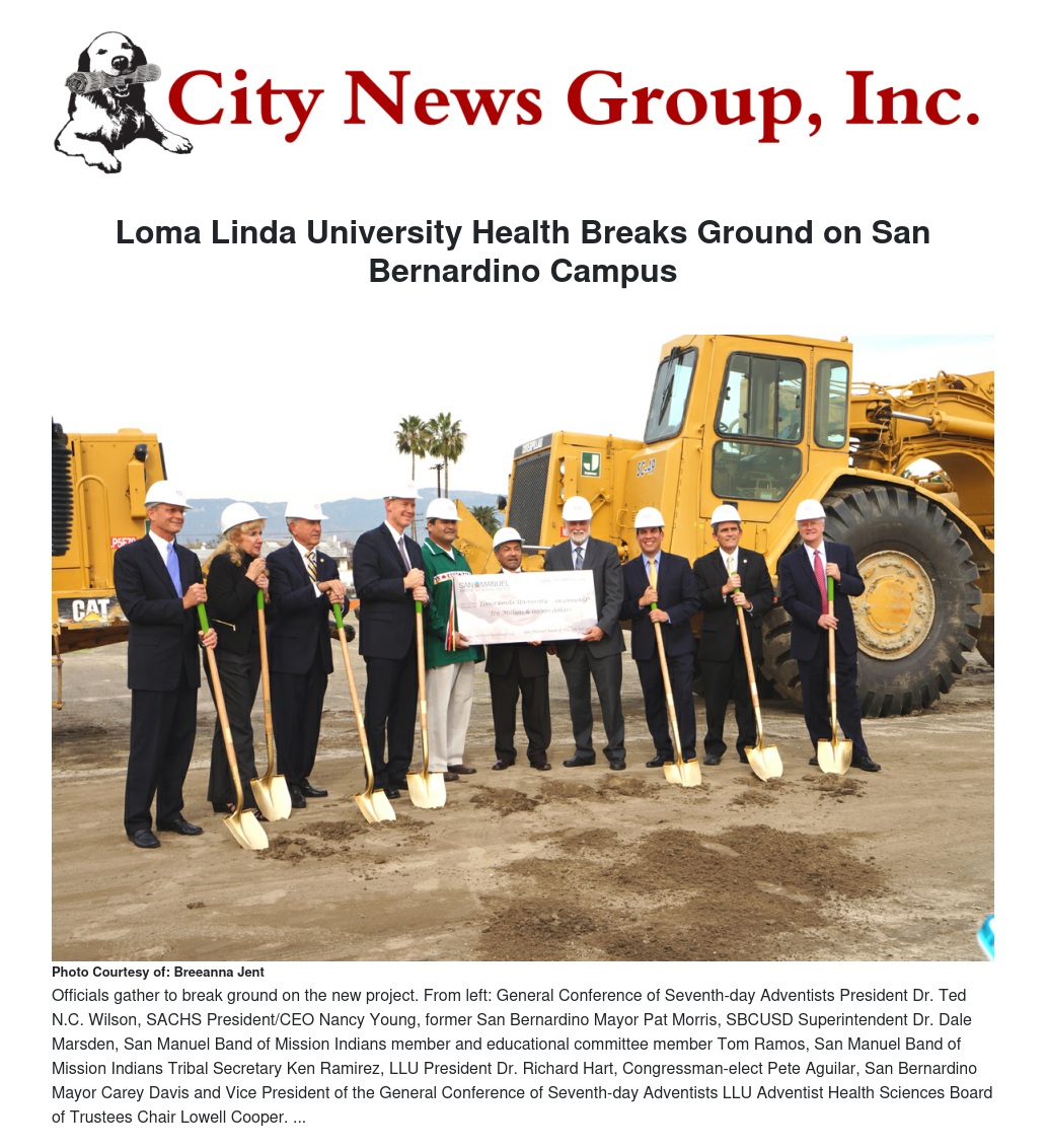 Officials from Loma Linda University Health, San Bernardino City Unified School District (SBCUSD), San Bernardino Community College District (SBCCD), the Social Action Corps Health System (SACHS), the San Manuel Band of Mission Indians and other city, county, state and federal leaders gathered to break ground on Loma Linda University’s newest campus Dec. 10.