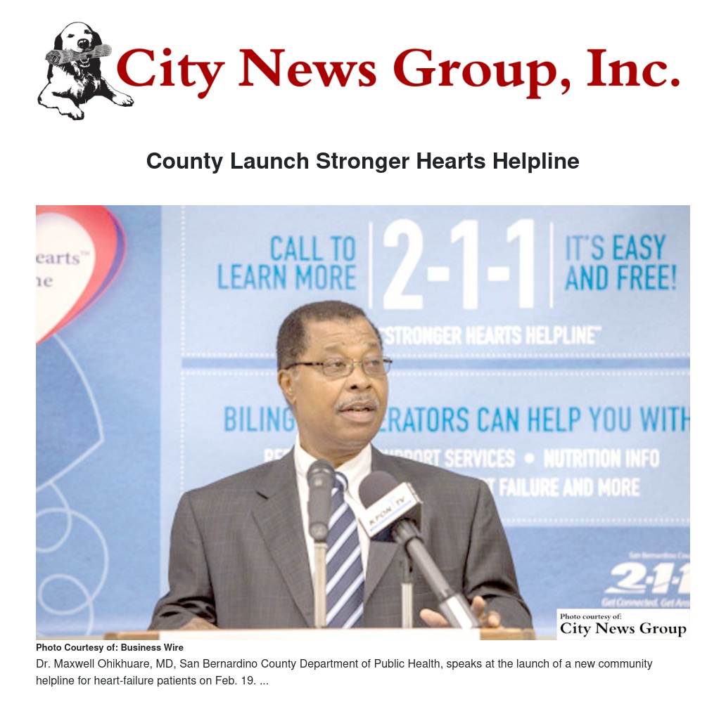 County Health Officer Dr. Maxwell Ohikhuare commented on the need to provide assistance to the number of individuals living with heart failure in San Bernardino County. “Many people with heart failure don’t fully understand the intricacies of the disease; to them, it may sound like a death sentence. The Stronger Hearts Helpline will give them easier access to information that can help them take control of their condition and stay healthier longer. I am thrilled that the National Forum chose our community to pilot this important resource.”