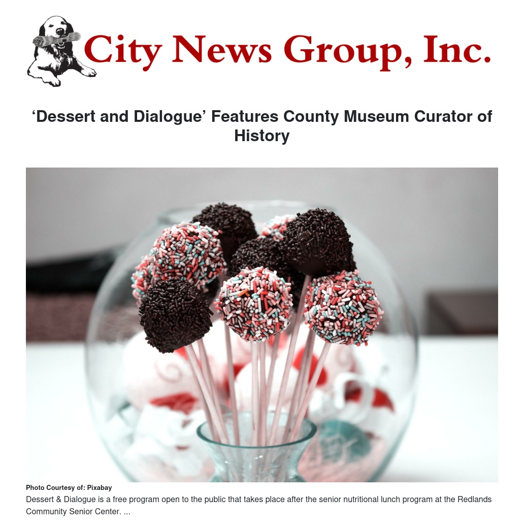 Dessert & Dialogue is a free program open to the public that takes place after the senior nutritional lunch program at the Redlands Community Senior Center.  Hot meals are served Monday through Friday from 11:30 a.m.-12:30 p.m. The hot meals are available to all adults. A donation of $3 is suggested for those 60 or older, and guests under 60 may enjoy lunch for $6.